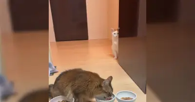 いつもと違う場所にごはんを置いただけで警戒する猫、毒見役を放って様子をうかがう「性格の違いがわかりやすい」