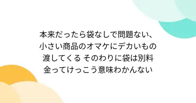本来だったら袋なしで問題ない、小さい商品のオマケにデカいもの渡してくる そのわりに袋は別料金ってけっこう意味わかんない