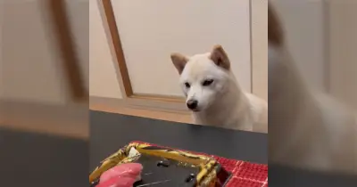 お腹いっぱいになったので寿司を残してたら犬がめっちゃ話しかけてくる「私のお腹には余裕がありますが…?」