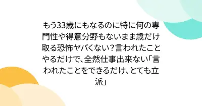 もう33歳にもなるのに特に何の専門性や得意分野もないまま歳だけ取る恐怖ヤバくない?言われたことやるだけで、全然仕事出来ない「言われたことをできるだけ、とても立派」