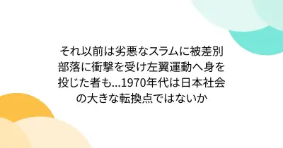 それ以前は劣悪なスラムに被差別部落に衝撃を受け左翼運動へ身を投じた者も...1970年代は日本社会の大きな転換点ではないか