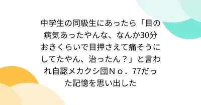 中学生の同級生にあったら「目の病気あったやんな、なんか30分おきくらいで目押さえて痛そうにしてたやん、治ったん?」と言われ自認メカクシ団No.77だった記憶を思い出した