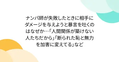 ナンパ師が失敗したときに相手にダメージを与えようと暴言を吐くのはなぜか…「人間関係が築けない人たちだから」「断られた恥と無力を加害に変えてる」など