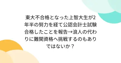 東大不合格となった上智大生が2年半の努力を経て公認会計士試験合格したことを報告→浪人の代わりに難関資格へ挑戦するのもありではないか?