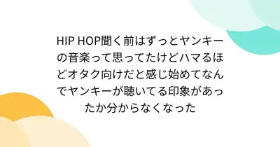 HIP HOP聞く前はずっとヤンキーの音楽って思ってたけどハマるほどオタク向けだと感じ始めてなんでヤンキーが聴いてる印象があったか分からなくなった