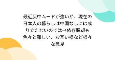 最近反中ムードが強いが、現在の日本人の暮らしは中国なしには成り立たないのでは→依存脱却も色々と難しい、お互い様など様々な意見