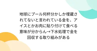 地球にプール何杯分かしか埋蔵されてないと言われている金を、アイスとかお肉に貼り付けて食べる意味が分からん→下水処理で金を回収する取り組みがある
