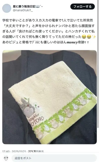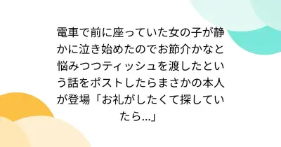 電車で前に座っていた女の子が静かに泣き始めたのでお節介かなと悩みつつティッシュを渡したという話をポストしたらまさかの本人が登場「お礼がしたくて探していたら...」