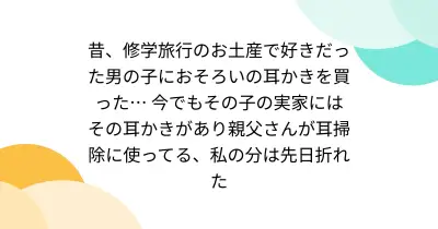 昔、修学旅行のお土産で好きだった男の子におそろいの耳かきを買った… 今でもその子の実家にはその耳かきがあり親父さんが耳掃除に使ってる 私の分は先日折れた