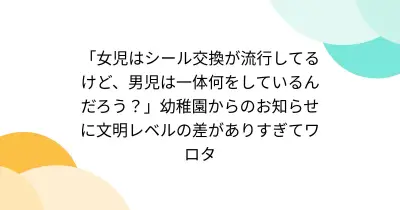 「女児はシール交換が流行してるけど、男児は一体何をしているんだろう?」幼稚園からのお知らせに文明レベルの差がありすぎてワロタ