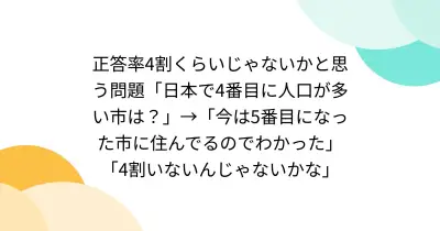 正答率4割くらいじゃないかと思う問題「日本で4番目に人口が多い市は?」→「今は5番目になった市に住んでるのでわかった」「4割いないんじゃないかな」