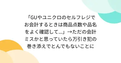 「GUやユニクロのセルフレジでお会計するときは商品点数や品名をよく確認して...」→ただの会計ミスかと思っていたら万引き犯の巻き添えでとんでもないことに