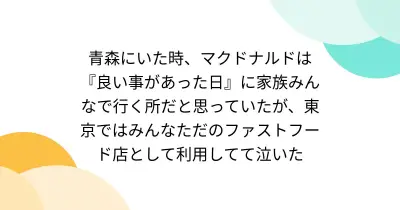 青森にいた時、マクドナルドは『良い事があった日』に家族みんなで行く所だと思っていたが、東京ではみんなただのファストフード店として利用してて泣いた