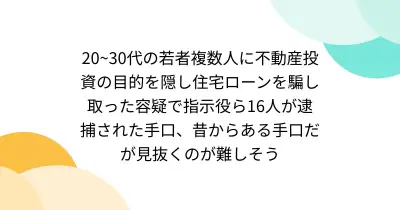 20~30代の若者複数人に不動産投資の目的を隠し住宅ローンを騙し取った容疑で指示役ら16人が逮捕された手口、昔からある手口だが見抜くのが難しそう