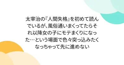 太宰治の『人間失格』を初めて読んでいるが、風俗通いまくってたらそれ以降女の子にモテまくりになった…という場面で色々突っ込みたくなっちゃって先に進めない