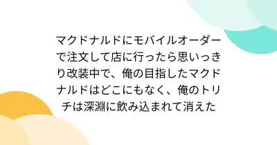マクドナルドにモバイルオーダーで注文して店に行ったら思いっきり改装中で、俺の目指したマクドナルドはどこにもなく、俺のトリチは深淵に飲み込まれて消えた