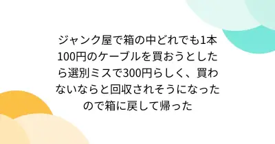 ジャンク屋で箱の中どれでも1本100円のケーブルを買おうとしたら選別ミスで300円らしく、買わないならと回収されそうになったので箱に戻して帰った