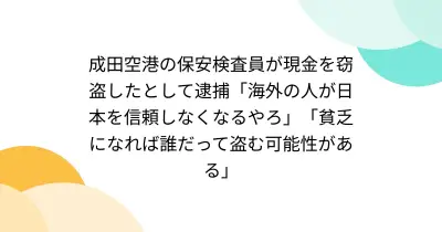 成田空港の保安検査員が現金を窃盗したとして逮捕「海外の人が日本を信頼しなくなるやろ」「貧乏になれば誰だって盗む可能性がある」