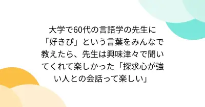 大学で60代の言語学の先生に「好きぴ」という言葉をみんなで教えたら、先生は興味津々で聞いてくれて楽しかった「探求心が強い人との会話って楽しい」
