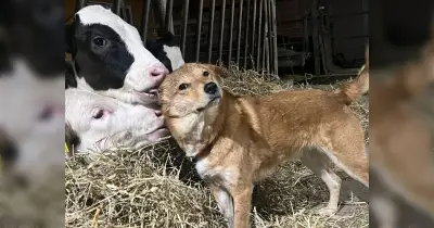 「弊社の育成舍担当の警備員が若手社員たちと交流してた」びちゃびちゃにする牛と満更ではない顔で受け入れている犬