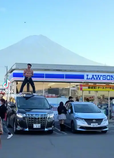 富士山が見えるローソン駐車場でレンタカーアルファードの屋根に土足でのり裸で踊るタイ人