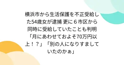 横浜市から生活保護を不正受給した54歳女が逮捕 更に6市区から同時に受給していたことも判明「月にあわせておよそ70万円以上!?」「別の人になりすましていたのかぁ」