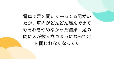 電車で足を開いて座ってる男がいたが、車内がどんどん混んできてもそれをやめなかった結果、足の間に人が数人立つようになって足を閉じれなくなってた