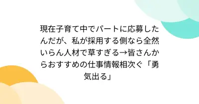 現在子育て中でパートに応募したんだが、私が採用する側なら全然いらん人材で草すぎる→皆さんからおすすめの仕事情報相次ぐ「勇気出る」
