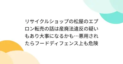 リサイクルショップの松屋のエプロン転売の話は産廃法違反の疑いもあり大事になるかも…悪用されたらフードディフェンス上も危険