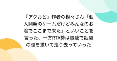 『アクおど』作者の橙々さん「個人開発のゲームだけどみんなのお陰でここまで来た」といいことを言った、一方RTA勢は爆速で話題の種を撒いて走り去っていった