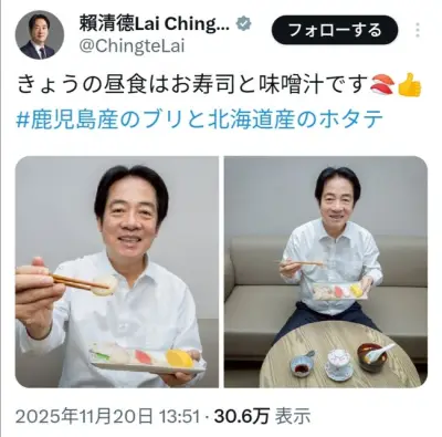 【朗報】台湾総統「今日の昼食はお寿司と味噌汁です🍣👍」