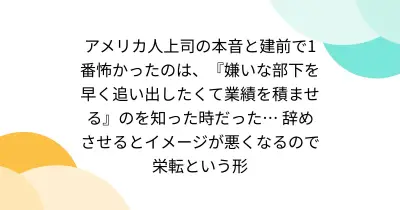 アメリカ人上司の本音と建前で1番怖かったのは、『嫌いな部下を早く追い出したくて業績を積ませる』のを知った時だった… 辞めさせるとイメージが悪くなるので栄転という形