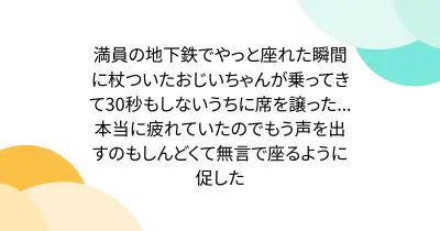 満員の地下鉄でやっと座れた瞬間に杖ついたおじいちゃんが乗ってきて30秒もしないうちに席を譲った...もう声を出すのもしんどくて無言で座るように促した