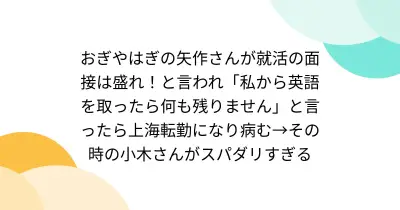 おぎやはぎの矢作さんが就活の面接は盛れ!と言われ「私から英語を取ったら何も残りません」と言ったら上海転勤になり病む→その時の小木さんがスパダリすぎる