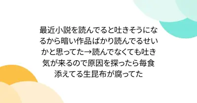 最近小説を読んでると吐きそうになるから暗い作品ばかり読んでるせいかと思ってた→読んでなくても吐き気が来るので原因を探ったら毎食添えてる生昆布が腐ってた