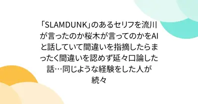 「SLAMDUNK」のあるセリフを流川が言ったのか桜木が言ってのかをAIと話していて間違いを指摘したらまったく間違いを認めず延々口論した話…同じような経験をした人が続々