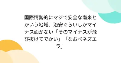 国際情勢的にマジで安全な南米とかいう地域、治安ぐらいしかマイナス面がない「そのマイナスが飛び抜けてでかい」「なおベネズエラ」