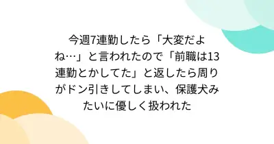 今週7連勤したら「大変だよね…」と言われたので「前職は13連勤とかしてた」と返したら周りがドン引きしてしまい、保護犬みたいに優しく扱われた