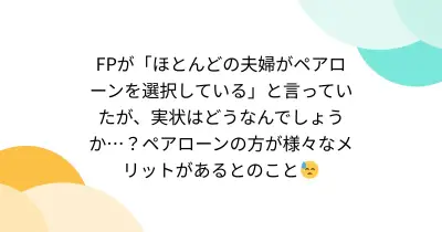 FPが「ほとんどの夫婦がペアローンを選択している」と言っていたが、実状はどうなんでしょうか…?ペアローンの方が様々なメリットがあるとのこと😓