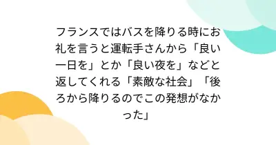 フランスではバスを降りる時にお礼を言うと運転手さんから「良い一日を」とか「良い夜を」などと返してくれる「素敵な社会」「後ろから降りるのでこの発想がなかった」