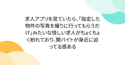 求人アプリを見ていたら、「指定した物件の写真を撮りに行ってもらうだけ」みたいな怪しい求人がちょくちょく紛れており、闇バイトが身近に迫ってる感ある