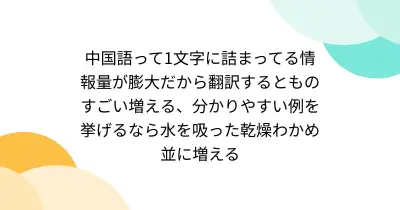 中国語って1文字に詰まってる情報量が膨大だから翻訳するとものすごい増える、分かりやすい例を挙げるなら水を吸った乾燥わかめ並に増える