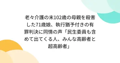 老々介護の末102歳の母親を殺害した71歳娘、執行猶予付きの有罪判決に同情の声「民生委員も含めて出てくる人、みんな高齢者と超高齢者」