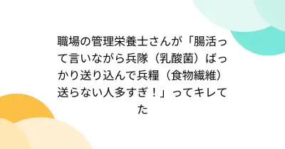 職場の管理栄養士さんが「腸活って言いながら兵隊(乳酸菌)ばっかり送り込んで兵糧(食物繊維)送らない人多すぎ!」ってキレてた