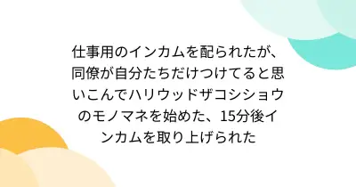 仕事用のインカムを配られたが、同僚が自分たちだけつけてると思いこんでハリウッドザコシショウのモノマネを始めた、15分後インカムを取り上げられた
