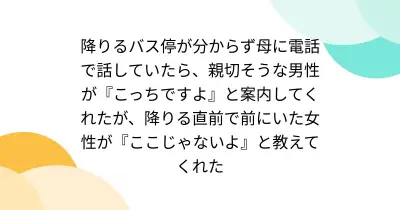 降りるバス停が分からず母に電話で話していたら、親切そうな男性が『こっちですよ』と案内してくれたが、降りる直前で前にいた女性が『ここじゃないよ』と教えてくれた