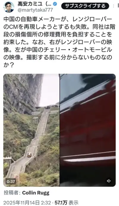 中国の自動車メーカー、レンジローバーCM再現を試みるも失敗。中国製は低性能と理解してなかった様子