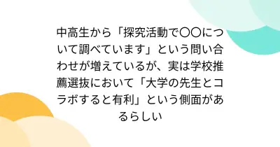 中高生から「探究活動で〇〇について調べています」という問い合わせが増えているが、実は学校推薦選抜において「大学の先生とコラボすると有利」という側面があるらしい