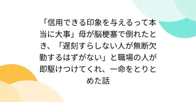 「信用できる印象を与えるって本当に大事」母が脳梗塞で倒れたとき、「遅刻すらしない人が無断欠勤するはずがない」と職場の人が即駆けつけてくれ、一命をとりとめた話