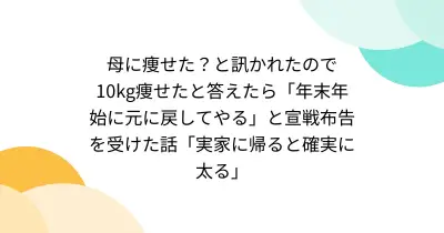 母に痩せた?と訊かれたので10kg痩せたと答えたら「年末年始に元に戻してやる」と宣戦布告を受けた話「実家に帰ると確実に太る」